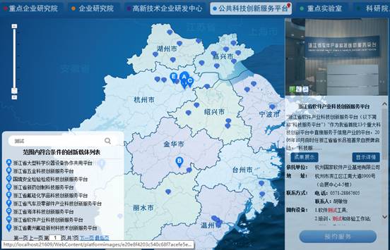 1. 企業(yè)或創(chuàng)業(yè)者從科技云平臺首頁www.zjsti.gov.cn登錄系統(tǒng)后點(diǎn)擊"預(yù)約服務(wù)"按鈕進(jìn)入創(chuàng)新地圖(或直接從科技云平臺首頁點(diǎn)擊"創(chuàng)新地圖"圖標(biāo)進(jìn)入)。在左側(cè)搜索框內(nèi)輸入所需要的設(shè)備或服務(wù)的關(guān)鍵字(如:測試),點(diǎn)擊搜索按鈕即可查找到符合條件的載體及服務(wù)信息。
